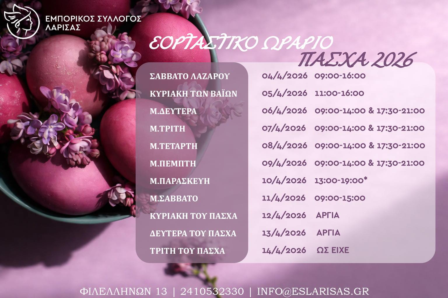 «Σας περιμένουμε και φέτος ενόψει της πασχαλινής περιόδου, στα εμπορικά καταστήματα της πόλης μας, για να επωφεληθούμε όλοι από τις πολύ ελκυστικές τιμές και την μεγάλη ποικιλία προϊόντων για τις πασχαλινές αγορές μας, στηρίζοντας την τοπική αγορά.
