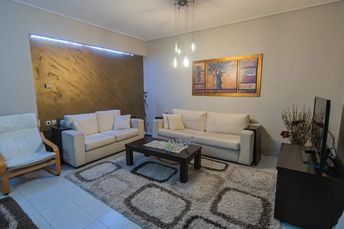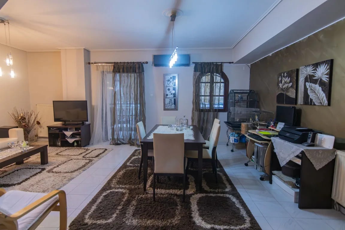 Αποτελείται από ευρύχωρο σαλόνι, ενιαία κουζίνα, δύο άνετα υπνοδωμάτια με ντουλάπες, μπάνιο με αποθηκευτικό χώρο (πατάρι), ένα ευρύχωρο μπαλκόνι με τέντα στο εμπρός μέρος της οικοδομής και ένα μικρότερο λειτουργικό στο πίσω μέρος. Διαθέτει αποθήκη στο υπόγειο και άνετη θέση parking στην πυλωτή. Η θέρμανση του γίνεται με ατομικό φ/α.