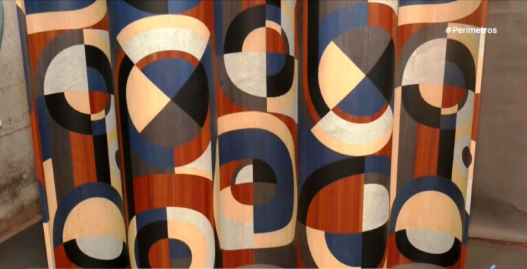 Φύλλα ξύλου δουλεμένα σε πιεστήριο για να πάρουν κυρτό σχήμα και να συναρμολογηθούν σε ένα διαχωριστικό, με γεωμετρικά μοτίβα, βαμμένο σε μια εξάχρωμη παλέτα ψυχρών και θερμών χρωμάτων.