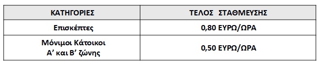 Στους υπαίθριους Δημοτικούς Χώρους στάθμευσης (parking) το τέλος στάθμευσης θα είναι 0,80 ευρώ /ώρα για όλους. Η χρέωση της στάθμευσης θα αρχίζει μετά τις δύο πρώτες ώρες από την υποχρεωτική δήλωση της στάθμευσης στην εφαρμογή της Flowbird ή στα παρκόμετρα.