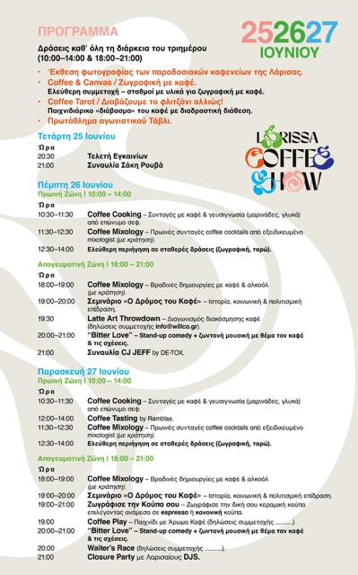 Στο πλαίσιο σχετικής συνέντευξης Τύπου που παρατέθηκε την Παρασκευή, 20 Ιουνίου, ο κ.Μαμάκος ανέφερε πως το Larissa Coffee Show είναι μια τριήμερη γιορτή (25, 26 και 27 Ιουνίου), που ενώνει τον πολιτισμό με τη διασκέδαση, την παράδοση με τη σύγχρονη επιχειρηματικότητα.